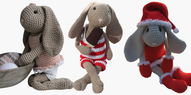 Inbegrepen in het patroon zit alle kleding en accessiores om het Paashaasje, de beach bunny en Flappie te haken.