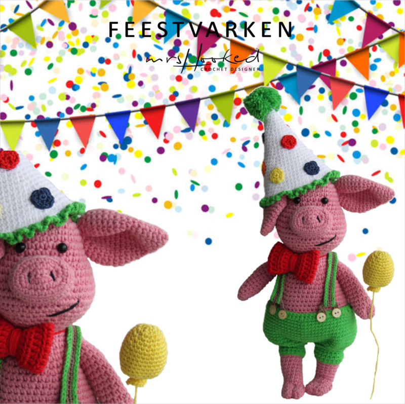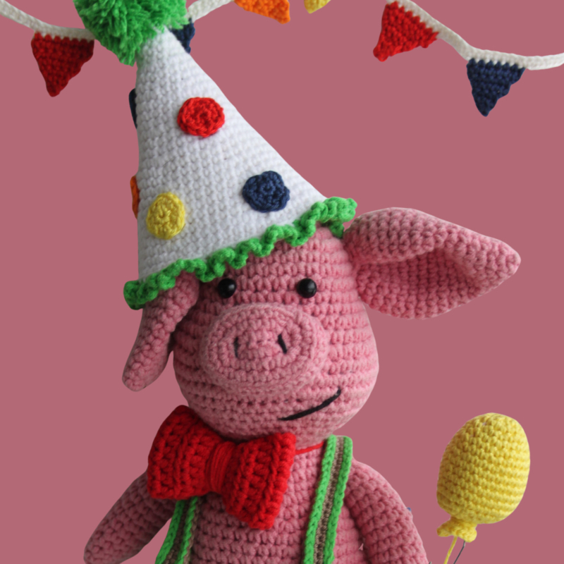 Porky at the beach. In een vrolijke zwembroek, met emmertje en zwemband in de hand gaat porky lekker naar het strand. Het patroon is inclusief de zwemkleding en feestkleding.